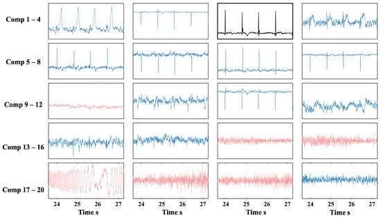 Independent components and their identification for real MCG signals processed using the adaptive ICA method.The ICs to be excluded are in red, the retained ICs are in blue, and the template IC is in black.