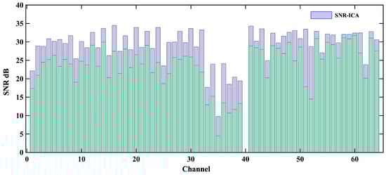 SNR of channels 1 to 64 and the SNR improvement ratio achieved using the adaptive ICA method.Green bar is the SNR before adaptive ICA.