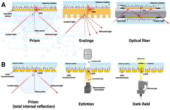 Most common SPR configurations using (A) an SPR in a prism-coupling configuration, grating-based couple, and optical fiber, respectively, and (B) an LSPR through total internal reflection measurement, extinction measurement, and dark-field measurement by a microscope. Adapted with permission from Ramirez-Priego et al. [] Copyright © (2024) Elsevier.