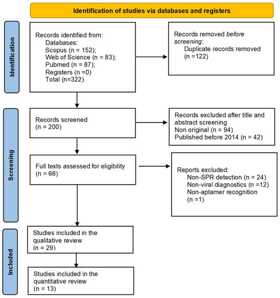 The number of studies identified in the three databases was 322 (Figure 2). Before screening, 122 duplicates were removed. Of the remaining 200 articles, 66 were appraised for full-text assessment once the eligibility criteria were considered. Finally, 28 studies met all of the inclusion criteria and were selected for qualitative and quantitative review. The analysis of these articles allowed the extraction of data related to SPR-based aptasensors focused on virus detection for diagnostic purposes.