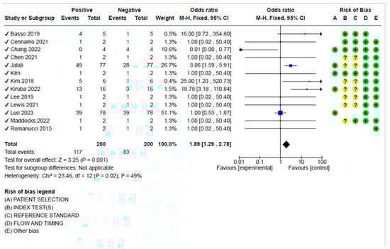 The sensitivity analysis considering the positive and negative samples showed a pooled diagnostic odds ratio of 1.89 (95%, CI 1.29–2.78), showing moderate heterogeneity (I2 = 49%, p < 0.001) (Figure 4).