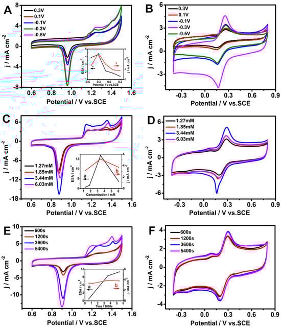 To optimize the synergistic effect of AuDNs and EPLEs, the deposition potential, electrolyte concentration, and deposition time were investigated. Figure 1A depicts the cyclic voltammograms (CVs) of the AuDNs/EPLE at different potentials in a 0.5 M H2SO4 solution. The corresponding electrochemical active surface area (ECSA) was calculated for each deposition potential (Figure 1A inset). The results revealed that the electrode deposited at −0.3 V exhibited the highest ECSA. Additionally, this deposition potential led to the highest current density with 5 mM [Fe(CN)6]3− (Figure 1B).