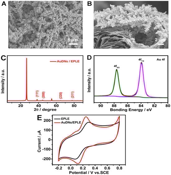 Characterization of AuDNs/EPLEs: (A) top view and (B) cross-sectional SEM images of AuDNs/EPLE; (C) XRD pattern of AuDNs/EPLE; (D) high-resolution XPS spectrum of Au 4f for AuDNs/EPLE; (E) cyclic voltammograms of EPLE and AuDNs/EPLE in 0.1 M KCl solution containing 5 mM [Fe(CN)6]3−/[Fe(CN)6]4−.