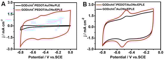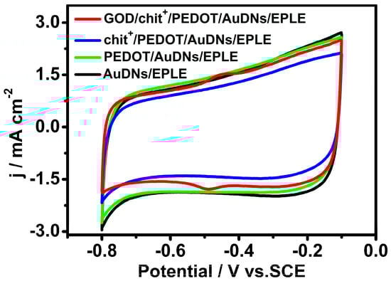 To investigate the electrochemical behavior of the immobilized GOD, cyclic voltammetry (CV) was performed in a pH 7.19 phosphate buffer solution. Figure 3 shows the CV curves of different electrodes. Interestingly, just the GOD/chit+/PEDOT/AuDNs/EPLE exhibited a pair of well-defined redox peaks at −0.448 V and −0.488 V, referring to the redox reaction of the FAD cofactor in GOD. These results indicate that the layer-by-layer assembly strategy effectively immobilized GOD onto the electrode surface and promoted direct electron transfer (DET) between the enzyme and the electrode.