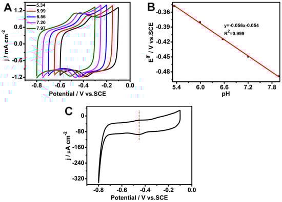 Electrochemical characterization of the GOD/chit+/PEDOT/AuDNs/EPLE: (A) CVs at pH 5.34, 5.99, 6.56, 7.20, and 7.97, scan rate 50 mV s−1; (B) plot of the peak potential versus pH; (C) CV curve at a scan rate of 1 mV s−1.