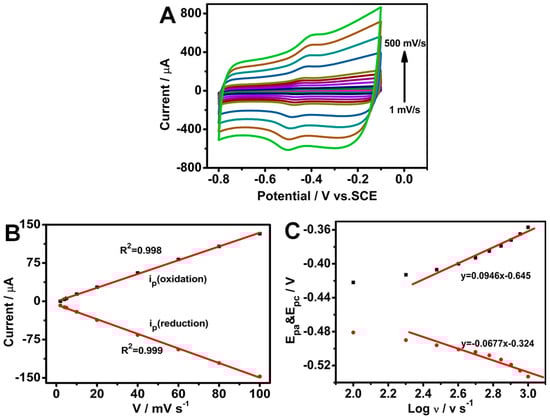 Moreover, as per Figure 6C, the peak-to-peak separation (ΔEp) increased with an increasing scan rate (greater than 100 mV s−1), suggesting a quasi-reversible process. The linear relationship between the peak potentials (Epa and Epc) and the logarithm of the scan rate (log v) was used to define the electron transfer coefficient (α) (Equations (5) and (6)) and the rate constant (ks) (Equation (4)). The calculated α value was 0.583, and the ks value was 1.394 ± 0.02 s−1. These results indicate that the composite electrode exhibits efficient electron transfer kinetics and good electrochemical performance.