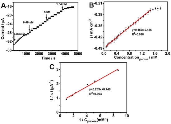In order to investigate the glucose sensing ability of the biosensor, the amperometric response under −0.45 V of the GOD/chit+/PEDOT/AuDNs/EPLE was examined with subsequent additions of glucose to a pH 7.19 PBS (Figure 7A). Equation (8) represents the oxidation of glucose oxidase (GOD), where GOD(FADH2) is oxidized in the presence of oxygen, which subsequently catalyzes the oxidation of glucose to gluconolactone (Equation (9)). Equation (8) leads to the simultaneous reduction of oxygen to hydrogen peroxide (H2O2) [32]. As the glucose concentration increases, the availability of oxygen at the electrode surface decreases, resulting in a decline in the oxygen reduction current. This depletion of oxygen leads to a corresponding reduction in the overall current response at higher glucose concentrations.