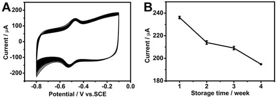CV was performed for 100 cycles at a scan rate of 50 mV s−1 in a pH 7.19 phosphate buffer solution with saturated O2 in order to assess the stability of the composite electrode. As shown in Figure 8A, the electrode retained approximately 90% of its initial peak current after 100 cycles, proving excellent electrochemical stability. Furthermore, the long-term storage stability of the electrode was evaluated by storing the electrode at 4 °C in a refrigerator for one month. After this storage period, it exhibited a retention of 82.5% of its initial current response, indicating good stability over time (Figure 8B).