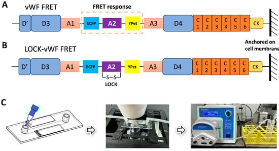 The FRET pair of fluorescent proteins ECFP and YPet was inserted into the full-length vWF, with the A2 domain flanked by the FRET pair (shown in Figure 1A). The vWF-based FRET biosensor was subcloned into the pDisplay vector which could direct the protein to the secretory pathway and anchor the biosensor on the surface of the cell plasma membrane by the transmembrane domain from platelet-derived growth factor receptor (PDGFR) [51]. This positioning scenario helped mimic vWF’s sensing of the hydrodynamic force while sticking to the under-endothelial layer of the vascular wall. We also prepared the mutated version by forming a disulfide bond between A2’s N- and C-terminals (LOCK-A2), named the LOCK-vWF biosensor (Figure 1B). The LOCK-A2 could resist the conformation change for vWF self-associations induced by flow shear [47].