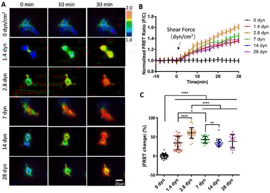 To examine whether the vWF-based biosensor was able to detect the hydrodynamic force, we applied different magnitudes of shear stress from 0 to 28 dyn/cm2 to the cells seeding in the microfluidic channels. 293T cells expressing the vWF-based biosensor on the cell surface showed apparent FRET responses to the shear flow, as presented by the FRET ratiometric images in Figure 2A (Supplementary Materials, Movie S1). Specifically, for the cells implanted on the single-channel flow chamber slides, without applying shear force to the cells, the FRET values did not change significantly (0 dyn); when the peristaltic pump was turned on to apply shear force, the biosensor showed clear FRET changes with the ratio (FRET/ECFP) increasing over time. The cells generally had more FRET changes at the cell boundaries, corresponding to the shear force exerted on the cell surface. The time-course curves from FRET/ECFP ratio quantifications on the cells demonstrated no FRET changes before flow, and gradual increases after flow applications (Figure 2B).