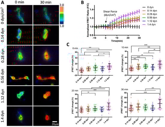 We further examined the mechanosensitivity of vWF under the scale of micro-shear forces. A gradual increment of micro-shear forces ranging from 0.14 to 1.4 dyn/cm2 was chosen to study the sensitivity of vWF-based FRET responses. The results showed that these micro-shear forces were sufficient to induce FRET responses from the conformation changes in the vWF-based biosensor (Figure 3A). Specifically, the FRET changes were positively correlated with the magnitudes of the micro-shear forces (0.14–1.4 dyn/cm2) (Figure 3B), demonstrating the ability of the cell membrane-anchored vWF-based biosensor in sensing the tiny hydrodynamic forces. By quantitatively comparing the responses to the gradient micro-shear forces, the FRET changes showed differences as early as 6 min after the flow applications with the lowest response from 0.14 dyn/cm2 (i.e., 1.4 μN/cm2), while 1.4 dyn/cm2 had a relatively higher response than the others through the 30 min flow processes (Figure 3C). These data indicate that the membrane-anchored vWF molecules are highly sensitive to the hydrodynamic forces.