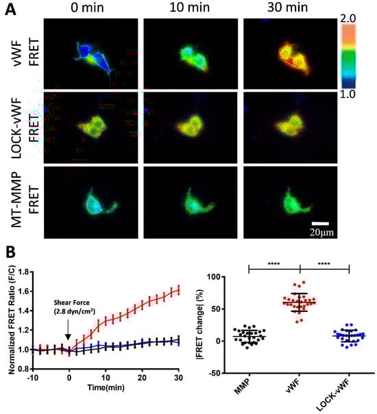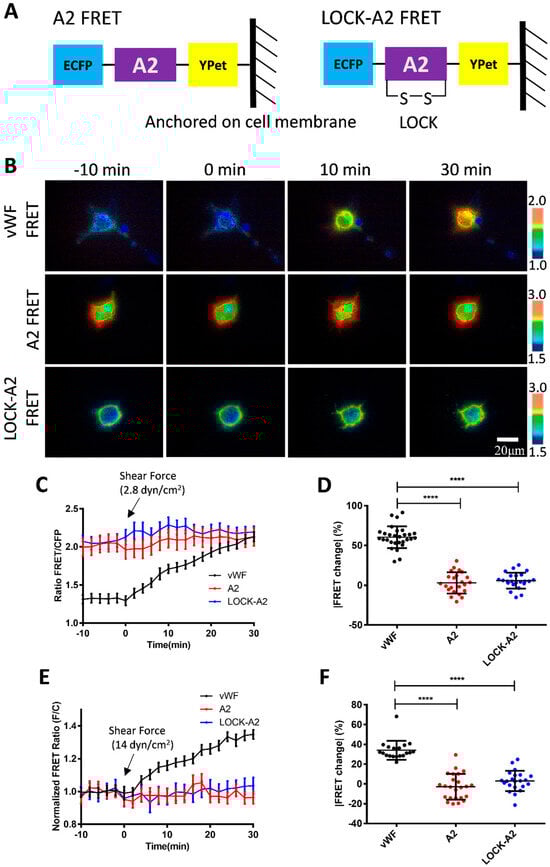 Previous studies have shown that the cause of some vascular hemophilia is due to the inability of the A2 structural domain in vWF to undergo a conformational change in a patient as compared to a normal human. The A2 domain is the mechanosensitive element in vWF, and the LOCK-A2 domain (with a disulfide-bond bridging of its N- and C-terminals) could resist the shear flow-induced vWF self-association and ADAMTS13 cleavage [47]. We generated a version of a vWF-based FRET biosensor containing LOCK-A2 (LOCK-vWF FRET), and also introduced an MT1-MMP biosensor as a control which is located on the cell surface but with a small molecular size [51]. Under 2.8 dyn/cm2 of flow, vWF FRET showed a 60% FRET change in 30 min, while the LOCK-vWF (with a higher basal FRET ratio) or MT1-MMP biosensors showed very little FRET change (Figure 4A,B). These results demonstrated that the structure-flexible A2 domain is essential for the flow-induced conformation change, and confirmed that the observed FRET change in the vWF biosensor was not from shear force exerted on the ECFP/YPet pair.