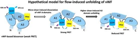 Regarding one concerning point that the vWF molecule may be modified from its natural structure in the biosensor, can provide some additional clarifications: (1) To avoid the structural interference, the ECFP and YPet fluorescent proteins are added into the flexible regions between the A1, A2, and A3 domains in vWF, and both ECFP and YPet proteins have their own flexible peptides at their N- and C-terminals. (2) The monitored vWF two-level unfolding in the biosensor by shear fluid was similarly observed in the previously published results performed with intact vWF single molecules by optical tweezers, which displayed two-stage extensions of the vWF [59]. Hence, we think that, probably, the vWF in the biosensor has basically conserved its structural and functional integrity under the current study condition.