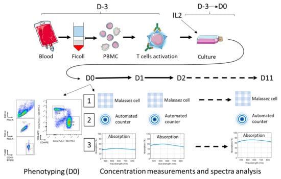 At D0, cell counts and viability assessments were performed by the Trypan blue/Malassez cell method. In addition, 5.4 × 106 T-cells were collected and resuspended in (RPMI-HS (8%)-PS (1%)-IL-2 (0.4 µL.mL−1) at 0.15 × 106 Tcells.mL−1, and 3 mL of this cell suspension was transferred into a spectroscopy cuvette for absorption spectrum measurement. The remaining T-cells were transferred to a T75 culture flask and incubated at 37 °C, 5% CO2.