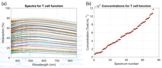 Absorption spectra and corresponding concentrations of dilution ranges of T-cells. (a) Absorption spectra (each color represents one concentration). (b) Corresponding concentrations measured with a Malassez cell. n = 73.