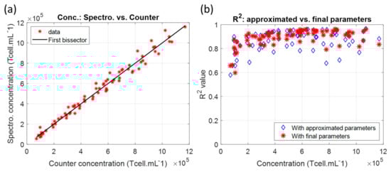The absorption function was used to fit the spectra of the dilutions (Figure 4a). The difference between spectrally measured and automatically counted concentrations did not exceed ±5%, as suggested by Figure 3b. This accuracy has been observed previously with CEM-C1 cell lines []. The goodness of fit was calculated (Figure 4b). R2 values were always above 0.8, except at a low concentration, where R2 decreased to 0.6. Nevertheless, the measurement accuracy remained in the accepted ±5% range even for concentrations for which the R2 around 0.6 is very low. This is discussed in Section 4.3. It should be noted that the R2 values obtained with the approximated parameters were more scattered than those obtained with the parameters calculated after minimization.