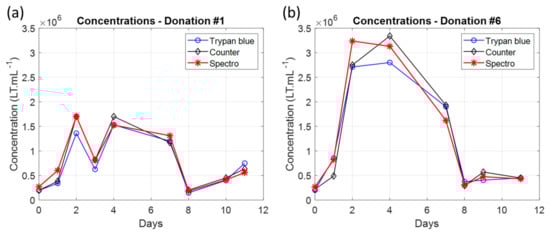 In Equation (3), is the concentration measured on day “i” with the measurement method Method and is the dilution factor specified in Table 4. Folds were calculated for all donations and examples of folds calculation for donations #1 and #6 are shown in Figure 6.