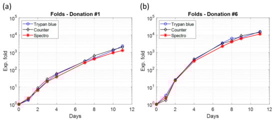 Examples of expansion folds obtained for each concentration measurement method. (a) Donation #1. (b) Donation #6.