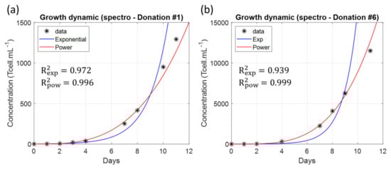 Examples of expansion folds fitted with either an exponential or a power function with corresponding R2 values. (a) Donation #1. (b) Donation #6. (a) and (b) are not drawn to the same scale. Black stars: concentrations spectrally measured, blue curves: exponential fitting and red curves: power fitting.