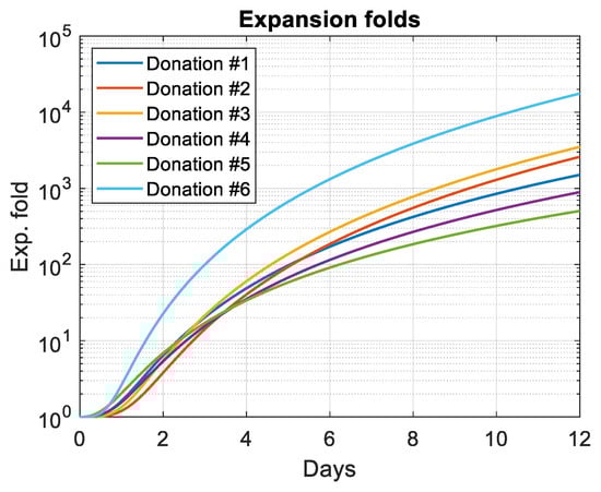 In Equation (8), C(2) represents the concentration at D2 when the suspensions contain mainly T-cells. A high Q value is associated with a high final fold (Table 10). This is always confirmed, except for donation #3. The latter showed an unexplained rapid increase in the fold value at D11, as shown in Table 10 (last row), where the percentage difference between the experimental fold value and the value fitted by Equation (4) is given.
