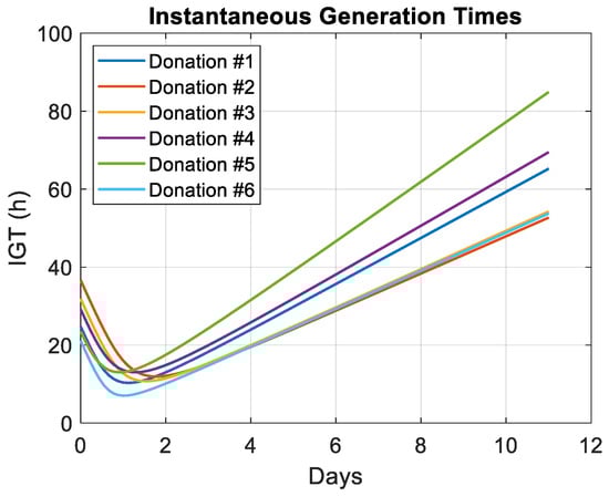 Instantaneous Generation Times (IGTs) calculated using Equation (7) for all experiments. Vertical scale in hours.