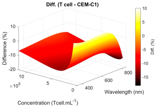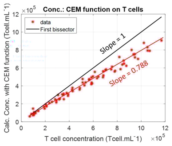 Previously, the absorption spectra of CEM-C1 cell lines were described by two Gaussian functions whose parameters depended on the cell concentration []. Concentrations were measured with an accuracy of about ±4.5%, sufficient for the intended applications and better than that obtained with an automated counter due to the representativeness of the samples collected for automated counting []. The function describing the shapes of the CEM-C1 spectra as a function of concentration was used to calculate the T-cell concentrations of the dilution ranges described in Section 2.5. Concentrations calculated with this function were systematically lower than the actual T-cell concentrations. A function corresponding to the optical properties of T-cell suspensions was then calculated using the method described in [].