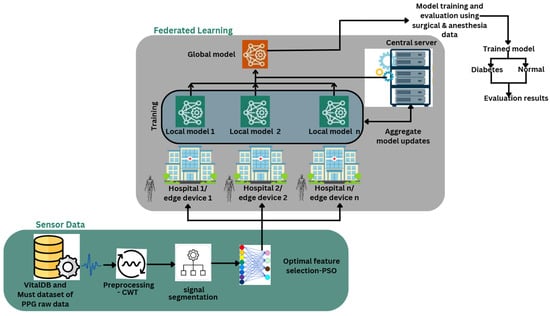 Figure 2 shows the entire procedure of the suggested FL framework for non-invasive BGL monitoring. Raw PPG signals are first obtained from VitalDB and MUST, two publically accessible datasets. Unprocessed PPG recordings from 82 people, 45 from the VitalDB dataset, and 37 from the MUST dataset, representing a range of physiological and demographic characteristics, are included in these datasets. However, noise from motion artifacts, inaccurate sensors, and ambient disturbances frequently affect raw PPG signals. For precise extraction and sorting of features, preprocessing methods like CWT are used to improve signal quality and denoise the signal. Further to preprocessing, the purified signal is partitioned into smaller temporal segments to extract significant patterns. Because PPG signals comprise time-series data, segmentation is essential for identifying significant patterns for further examination. Feature selection is performed using PSO to enhance system reliability and identify the most relevant features, thus lowering computational complexity and increasing precision in classification. The PPG data is distributed among numerous hospitals, typically utilizing edge devices for local model training instead of sending raw patient data to a centralized database. This federated learning approach prioritizes security and privacy of data, preventing unauthorized access to sensitive patient data. Each hospital formulates a localized model employing PSO-optimized PPG characteristics, allowing the model to identify patterns related to diabetes. Hospitals communicate only updated models to a centralized server for aggregation instead of supplying raw data. The central server aggregates inputs from several healthcare organizations and integrates them into a unified model, exploiting the diverse datasets from distinct hospitals. Employing federated learning improves the model’s generalization and reliability, later augmenting its accuracy in diabetes diagnosis. The global model undergoes additional training and validation using data from surgical and anesthetic patients to improve its accuracy and ensure reliable performance in real clinical settings. After completion of training, the model can expertly classify patients, such as normal or diabetic, with risk levels varying from minimal to extreme risk.