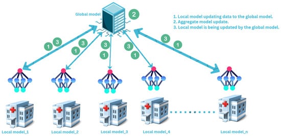 Subsequently, the model is transmitted to the server for updating. Rather than transmitting raw data, every hospital or device conveys solely the model modifications to the central server for aggregation and is referred to in Equation (30):