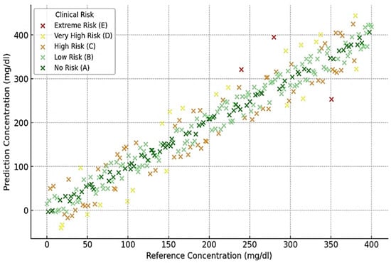 The consistency and accuracy of PPG-based BGM were significantly enhanced through the integration of artificial intelligence (AI) and machine learning (ML) [19,20,21,22,23,24,25]. These methods facilitate the identification of complex patterns in signals from PPG to correlate with fluctuations in blood sugar levels, resulting in the development of predictive models that accommodate the physiological differences of each individual. Additionally, AI-driven methodologies enhance the modification of BGM systems, thus improving their efficiency and longevity. To improve the precision of BGL models for forecasts, certain studies have concentrated on feature extraction methodologies [24,25]. To capture physiological differences associated with glucose levels, these methods analyze PPG data and extract critical data, for instance, waveform features, pulse rate, and pulse amplitude [12,14]. Experts are required to increase reliability and precision by adding these features to replicas for forecasting. Other variables like HbA1c (i.e., glycated hemoglobin) levels were also combined into the models of several types of research. It can be an obliging component in the BGL forecast because it is the mean BGL for the preceding two to three months. Nonetheless, there are risks to utilizing HbA1c alone, as it fails to recognize rapid or short-term alterations in blood sugar levels, an issue that real-time PPG monitoring resolves. Numerous investigations were examined using raw PPG signals alone for BGL evaluation [26]. Instead of manually creating novel features, they used the PPG waveform’s previous information to obtain descriptive observations directly. The above method streamlines the process and lowers computer complexity without sacrificing glucose level estimation precision.