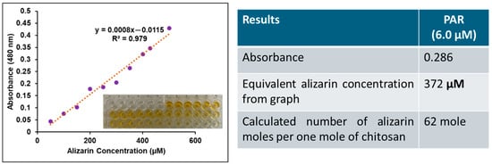 Calculation of the number of alizarin red molecules attached to chitosan by measuring the absorbance of alizarin red in the PAR after its selective reaction with PBA at 480 nm.