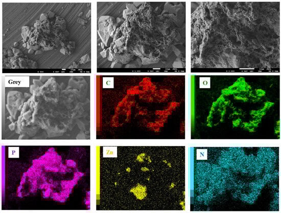 SEM images of Zn–Ab–PAR–IHN abbreviated as PARIHN with EDS-elemental mapping of C, O, P, Zn, and N at 15.0 KV.