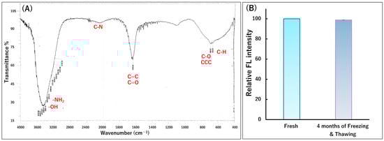 Afterward, we conducted FT-IR measurements for the PARIHN, and the results are shown in Figure 4A. There are multiple peaks at 3200 to 3600 cm−1, which corresponds to the stretching peaks of OH and NH groups of chitosan [,] and the catechol groups of alizarin red []. The peaks at 1635 cm−1 and 1680 cm−1 correspond to C=C and C=O groups of alizarin red []. The peaks at 653 cm−1 and 680 cm−1 correspond to the bending peak of C-H [] of chitosan and C-O and CCC [] peak of alizarin red, respectively. Next, as a stability test for PARIHN in PBS buffer pH (7.4), the FL intensity was measured upon reaction with PBA after repeated freezing and thawing processes for four consecutive months, as shown in Figure 4B. The results show that PARIHN is extremely stable in PBS.