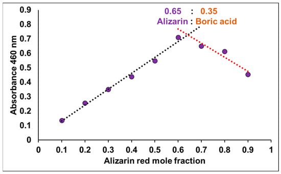 Job’s plot for the reaction between chitosan–alizarin and boric acid, where the black line is the absorbance increase trend line, and the orange line indicates the absorbance decrease trend line, both intersecting at nearly 0.65 indicating the ratio of 2:1, alizarin: boric acid.