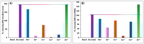 Effect of different metals on the fluorogenic reaction of PAR with (A) boric acid and (B) PBA. Where no metal, Pb2+, Ni2+, Fe3+, Cu2+, Co2+, and Zn2+ are represented by violet, blue, pink, orange, red, dark blue, and green columns, respectively.