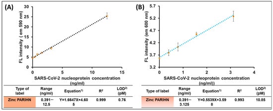 Calibration curves for (A) SARS-CoV-2 nucleoprotein (ng/mL) against FL intensity using Zinc PARIHN and PBA, and (B) SARS-CoV-2 nucleoprotein (ng/mL) against FL intensity using Zinc PARINH and boric acid. Where 1) the regression equation where Y is the FL intensity and X is the PARIHN concentration in ng/mL, 2) LOD = 3SD/Slope.
