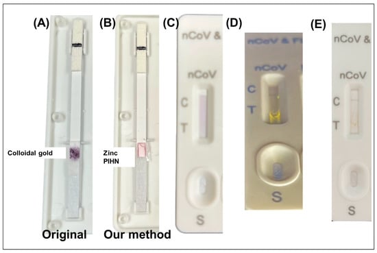 Modification of the commercially available gold test strip with Zinc PARIHN and comparison of the results with the naked eye: (A) Original immunochromatographic strip with colloidal gold. (B) Our method, where the colloidal gold was removed and replaced with Zinc PARIHN. (C) After adding the SARS-CoV-2 nucleoprotein-positive solution to Zinc PARIHN. (D) SARS-CoV-2 nucleoprotein-positive test using Zinc PARIHN at 245 nm. (E) The SARS-CoV-2 nucleoprotein-positive test was performed using Zinc PARIHN in normal lighting.