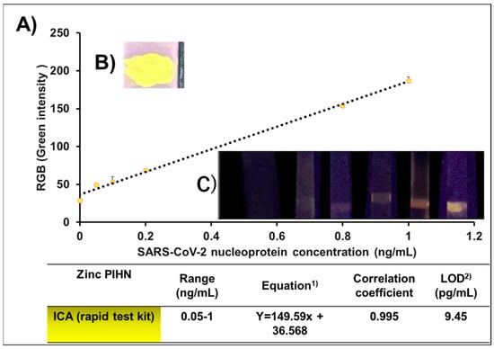 (A) Calibration curve SARS-CoV-2 nucleoprotein (ng/mL) against RGB (green intensity) using Zinc PARIHN and PBA. (B) A picture of the vivid yellow FL of 1 ng/mL of Zinc PARIHN and PBA under 254 nm, and (C) Quantitative FL assay of SARS-CoV2 N protein using the developed test strip under UV lamp, where from right to left concentration of COVID-19 are 0, 0.05, 0.1, 0.2, 0.8, and 1.0 ng/mL. Where 1) the regression equation where Y is the FL intensity and X is the PARIHN concentration in ng/mL, 2) LOD = 3SD/Slope.
