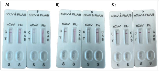 The original kit when using 1 and 5 ng/mL of SARS-CoV-2 nucleoprotein: (A) One minute of adding one ng/mL solution to the left and five ng/mL to the right, (B) after 5 min, and (C) after drying completely.