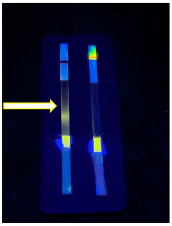 Selectivity of the developed test strip, where on the left side, the fixed capture Ab is for SARS-CoV-2 while on the right side, two Abs for influenza A and B were fixed. As can be seen, the FL signal only develops on the left side (indicated by the arrow).
