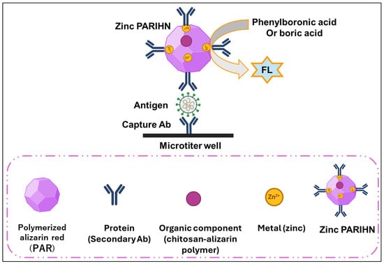 In this study, we developed a zinc PARIHN fluorescence immunosorbent assay that generates both fluorescence and colorimetric signals through reactions with boric acid derivatives (Scheme 1). The zinc PARIHN demonstrated stability, enhanced sensitivity due to increased surface area, and maintained antibody activity, all while being synthesized via a non-toxic, straightforward method. The fluorogenic reaction of alizarin with boric acid derivatives is rapid, yielding a product with strong fluorescence at longer wavelengths. These attributes position zinc PARIHN as an excellent candidate for labeling immunosorbent assays.