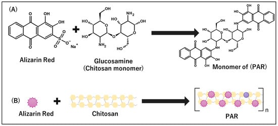 Synthesis of PAR: (A) simplified illustration of the nucleophilic substitution process between alizarin red and chitosan, which forms PAR by displacing the sulfonate group, and (B) sketch of the formation of PAR.