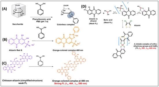 Illustrating (A) the reaction of PBA and any saccharide, (B) the reaction between PBA and alizarin, (C) the reaction between PBA and chitosan–alizarin polymer showcasing both colorimetric and fluorescent detection wavelength, and (D) the proposed mechanism of the reaction of boric acid with alizarin.