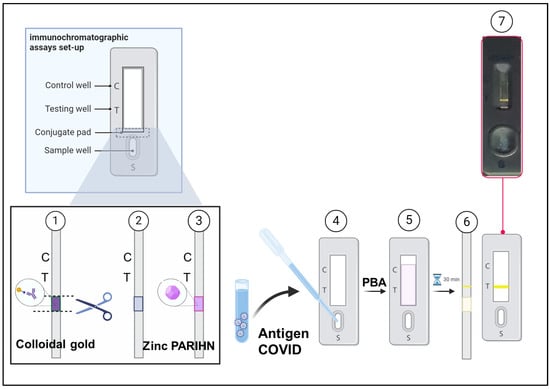 Illustration of a commercially available ICA design showcasing the traditional setup design with control and testing line, conjugated pad, and sample well. It also illustrates the general replacement of colloidal gold with Zinc PARIHN in the membrane and the subsequent fluorescent development upon adding the antigen “COVID” to the strip: (1) The traditional colloidal gold typically used in ICA is cut out of the membrane. (2) The membrane without colloidal gold. (3) Zinc PARIHN replaces the colloidal gold in the membrane. This modification enhances the sensitivity and detection capabilities. (4) The sample containing the antigen “COVID” is applied to the strip. (5) Followed by reagent addition after the COVID sample has migrated across the membrane, PBA is added to initiate an FL reaction, and (6) after 30 min, a visible bright yellow/orange fluorescent line is generated at 245 nm. (7) This FL line indicates the presence of the target antigen (COVID).