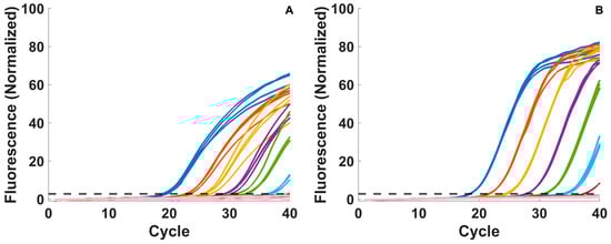 (A) Standard curves for adaptive PCR with 1370 nm heating and (B) corresponding commercial Rotor-Gene PCR curves. Concentrations are 105 copies/µL (dark blue), 104 copies/µL (red), 103 copies/µL (yellow), 102 copies/µL (purple), 101 copies/µL (green), 100 copies/µL (light blue), and 10−1 copies/µL (magenta). NTCs are indicated by the light pink lines.