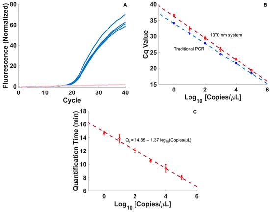 Performance of the 1370 nm direct heating system. (A) Singleplex PCR data from the 1370 nm PCR instrument (blue, n = 4) show consistent Cq performance (20.5 ± 0.35) in less than 15 min at a target concentration of 105 copies/µL. Forty cycles were completed in 14.62 ± 0.42 for all seven samples. Triplicate NTCs (pink) returned negative results. (B) Standard curve comparison between the 1370 nm system (red) and traditional PCR system (blue) show that the 1370 nm system has comparable performance to traditional PCR instrumentation (n = 4, mean ± SD). (C) Quantification time as a function of target concentration (red) shows that a positive result can be obtained within 15 min, with results under 10 min for high copy numbers.