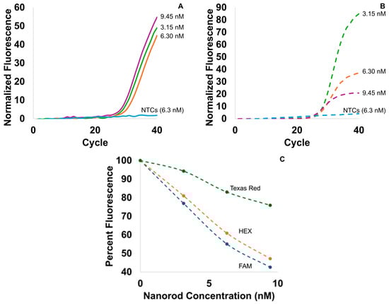 Performance of the 808 nm indirect heating system. (A) Averaged 808 nm PCR results for three different nanorod concentrations (n = 6). The plot for 9.45 nM reflects the single positive result (1/6). (B) Average Rotor-Gene PCR controls for the 808 nm samples (n = 2) had similar shapes but reduced fluorescence values as the nanorod concentration increased. (C) The percent fluorescence of samples containing nanorods relative to 0 nM control samples shows that the nanorod concentration interfered with fluorescence measurements on all three fluorescence channels used in these experiments (n = 3).
