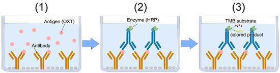 The enzyme-linked immunosorbent assay (ELISA) is one of the most common methods for measuring salivary OXT concentrations [12,13,14]. In this assay, antigen levels are typically quantified through spectroscopic analysis. Although ELISA is a reliable method, there are still numerous challenges associated with its use in daily life, particularly in terms of performing it as soon as samples are collected; therefore, there is a pressing need for portable and cost-effective ELISA measurement systems that are suitable for daily use.