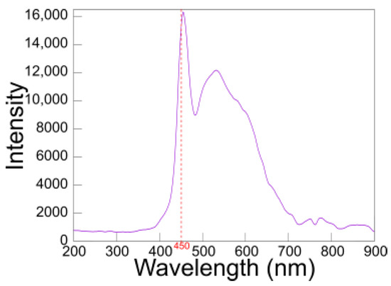 For our system, we employed a sandwich ELISA format to detect OXT. In a sandwich ELISA, two specific antibodies form an antibody–antigen–antibody complex (Figure 1). Horseradish peroxidase (HRP)-labeled antibodies were used as detection antibodies, while 3,3′,5,5′-tetramethylbenzidine (TMB) served as the chromogenic reagent. TMB produces a blue color in the presence of hydrogen peroxide; upon stopping the reaction with sulfuric acid, the color changes to yellow, with maximum absorbance at 450 nm. This wavelength (450 nm) corresponds to the emission spectrum of LEDs commonly found in typical smartphones (Figure 2).