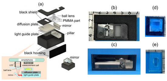 The configuration of the optical immunosensing unit. (a) The structure of the optical device and the attachment for the LED light source. Photographs show the optical unit from (b) the top view and (c) a cross-sectional view. Photographs show (d) the attachment for the smartphone LEDs and (e) the measurement cell.