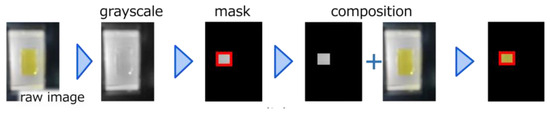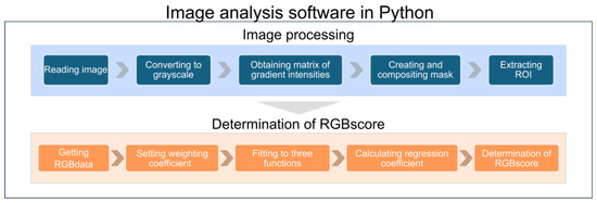 We employed lab-built image analysis software to determine the RGBscore from a dataset of images. The software was implemented using Python 3.10.7, and it leveraged OpenCV 4.7.0 (a comprehensive library of image processing algorithms and methods). An image captured by the measurement cell underwent two main processing routines: the ‘image processing phase’, which automatically extracted regions of interest (ROIs) from the input images of color solutions, and the ‘RGBscore determination phase,’ which optimized the weighting and calculated the RGBscore (Figure 4). In the image processing phase, the input image was converted to grayscale and the upper left 200 px × 200 px region was extracted as the search window. A Laplacian 8-direction filter, which took the second derivative of the image, was applied to calculate the gradient intensity within the search window. This process was repeated as the search window slid from the upper left to the bottom right of the source image. The region with the lowest gradient intensity, corresponding to the sample inlet of the measurement cell, was extracted as the ROI. The extracted ROI was decomposed into its respective RGB components and stored in two-dimensional arrays. In the ’RGBscore determination phase’, the RGBscore was defined as a score calculated using Equation (1).